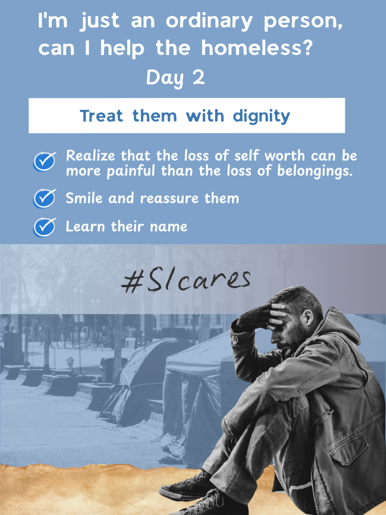 Day 2 – Treat them with dignity, realize that the loss of self worth can be more painful than the loss of belongings. Smile when engaging with them and take the time to learn their names.